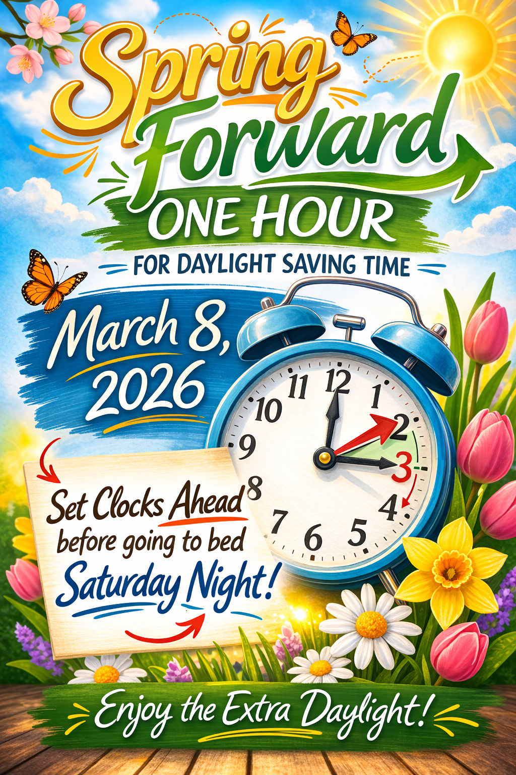 Spring Forward one hour this Saturday night! Daylight Saving Time begins Sunday, March 8, 2026!