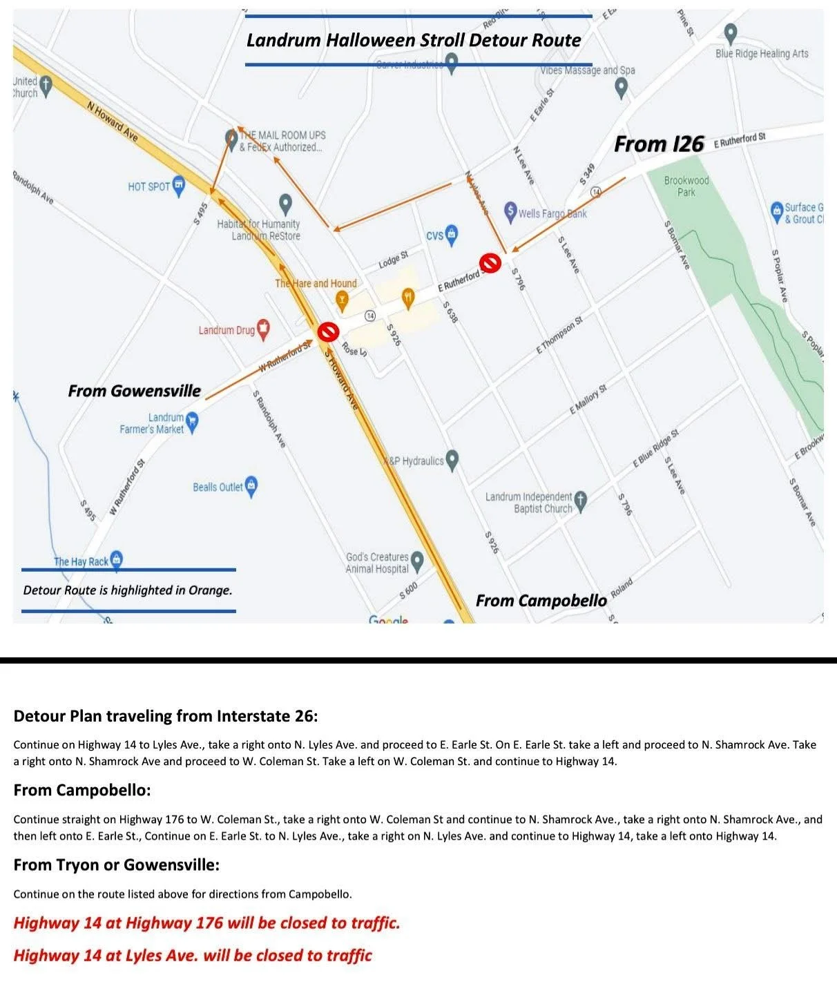 The parade will begin at the Landrum Depot, travel down North Trade Avenue, turn left onto East Rutherford through downtown, and end at Landrum Middle School. Please reference to detour map for alternate route. Thanks everyone!